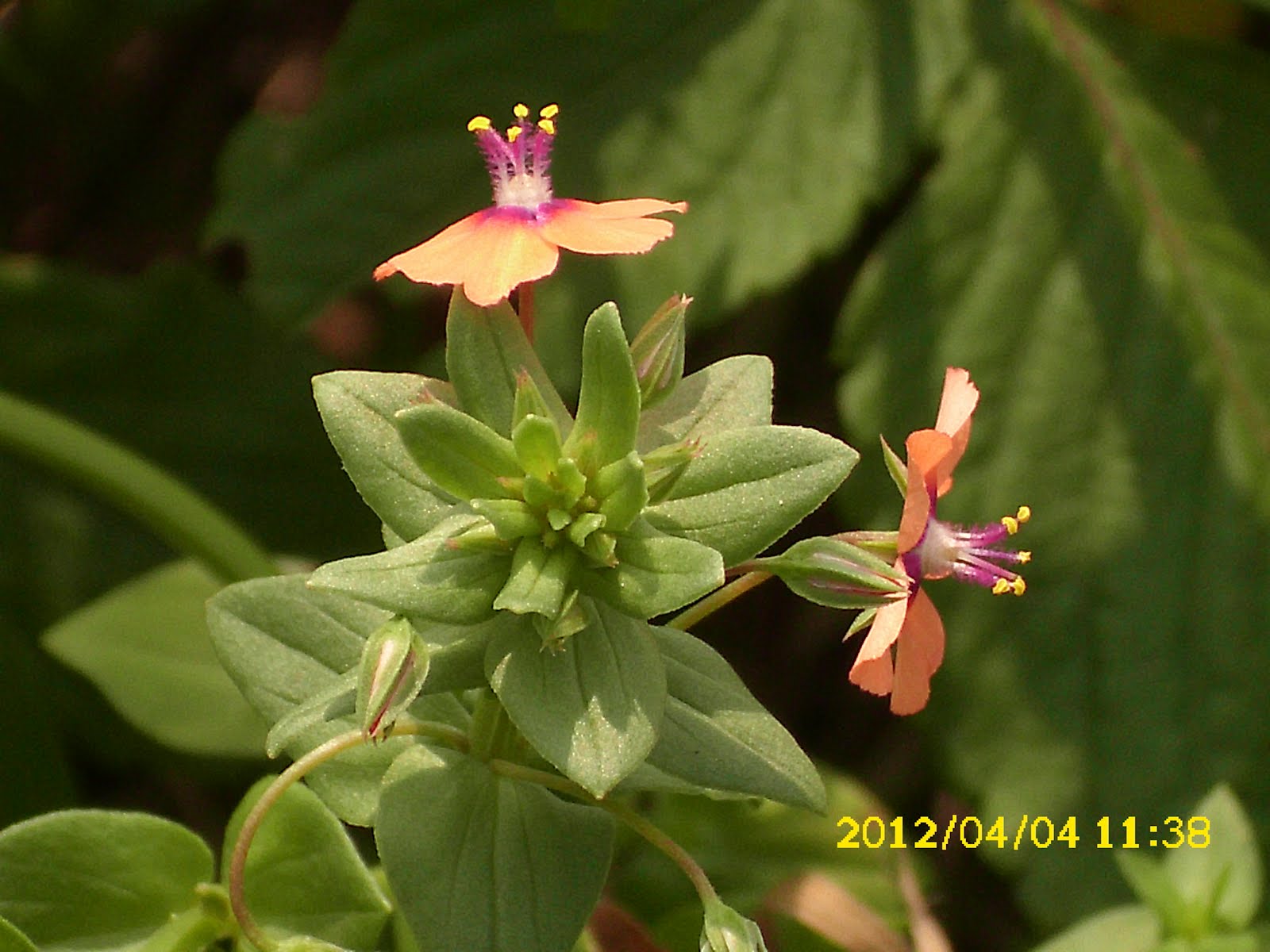 海綠[琉璃繁縷] 報春花科 海綠屬 俗名:火金姑" 一年生草本,莖方形細長,下方傾伏地上,上方斜上。葉對生,無柄,全緣,寬披針形,葉背有黑點。花單朵腋生,碧藍色[少數為"橘紅色},花冠5,徑約1公分,花午時開,午後閉,花期長。(晴日開花上午十點到下午二點左右)種子黑褐色。果為蒴果,球形。
