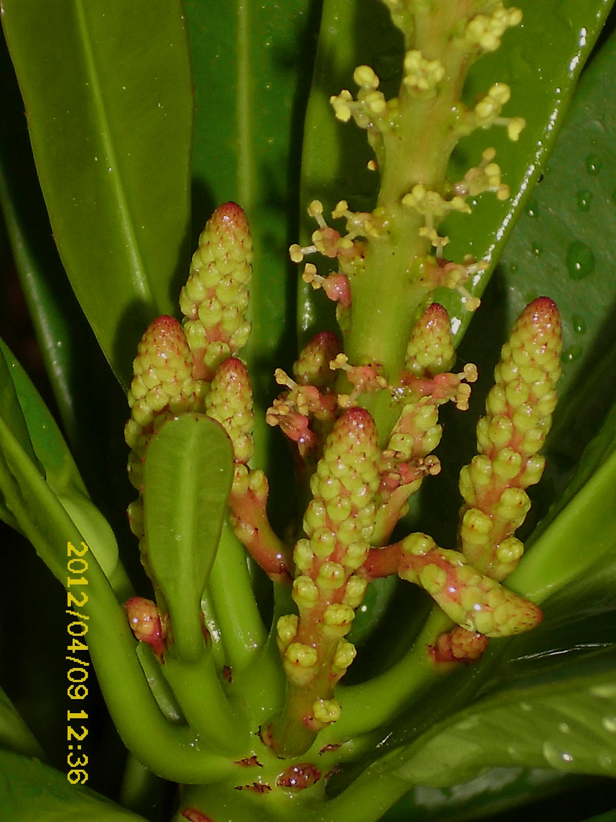 蘭嶼土沉香 大戟科 雌雄異株 台灣特有種。產蘭嶼、綠島。常綠小喬木。葉枝端叢生,倒披針形,圓頭或鈍頭,銳基。邊緣略反捲。穗狀花序 黃色;蒴果由綠色轉為褐色。